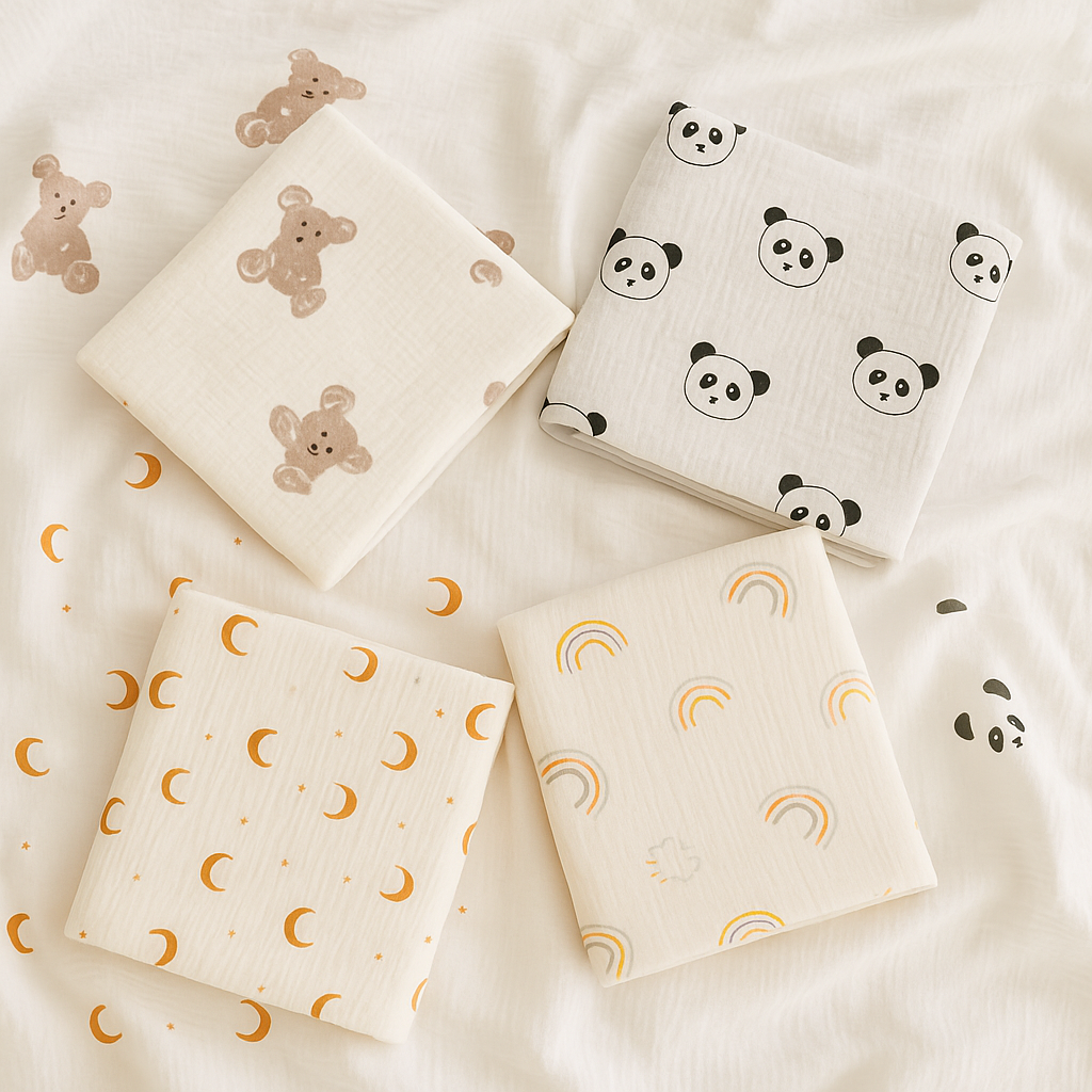 Wrap your baby in gentle comfort with this breathable cotton muslin swaddle blanket. Crafted from pure muslin cotton, the fabric feels soft and soothing against delicate skin, ensuring cozy all‑season use. Featuring multiple charming prints, this lightweight blanket is versatile enough for swaddling, tummy time, stroller outings or adding a soft layer to car seats and play mats. It is designed to resist pilling and pulling, staying smooth and fresh even after many washes. Safe and non-toxic, this blanket supports healthy baby skin and machine‑washable for easy care.